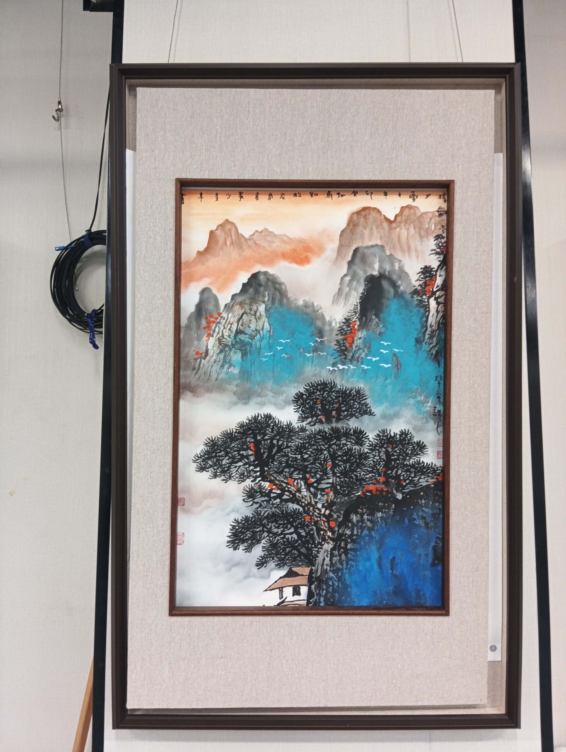 This work blends traditional Chinese landscape painting with rich mineral color application: